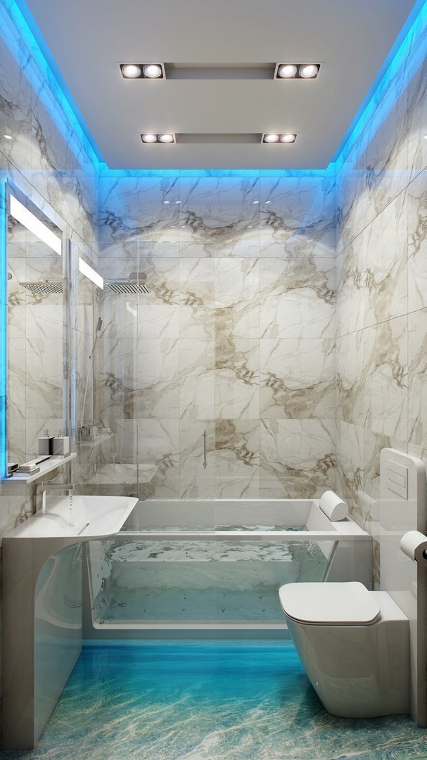 В последнее время очень популярной становится декоративная подсветка, позволяющая не только удачно решить световое зонирование ванной, но и придать нужный цветовой фон интерьеру, чтобы создать уютную атмосферу для принятия ванны после трудового дня.