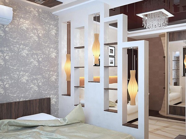 С помощью разных вариаций, можно зонировать помещение, сделать красивые ниши для разных мелочей, заменить большие и громоздкие шкафы, что в свою очередь значительно экономит пространство и придает Вашему дому изюминку и уют.